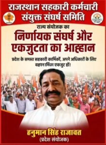जयपुर। राजस्थान सहकारी कर्मचारी संयुक्त संघर्ष समिति के प्रदेश संयोजक हनुमान सिंह राजावत ने प्रदेश के समस्त सहकारी पैक्स-लैम्पस कार्मिकों को एकजुट होने और अपने अधिकारों के लिए निर्णायक संघर्ष का आह्वान किया है। उन्होंने स्पष्ट किया कि सहकारी आंदोलन की नींव एकता पर टिकी है और वर्तमान समय अपनी ताकत दिखाने का सबसे सुनहरा अवसर है। प्रदेश संयोजक ने कहा कि यह बहिष्कार किसी व्यक्ति विशेष के लिए नहीं, बल्कि हर कर्मचारी के स्वयं के हक की लड़ाई है। उन्होंने इस समय को संगठन की असली ताकत बताया है।आंदोलन के बीच भी कार्य में जुटे कर्मचारियों को कड़ा संदेश देते हुए राजावत ने कहा कि अपने साथियों की नजरों से गिरकर व्यवस्था का ‘लाडला’ बनने की कोशिश न करें। उन्होंने आगाह किया कि जो आज साथ नहीं हैं, कल उन्हें भी इसी व्यवस्था की चुनौतियों का सामना अकेले करना होगा। उन्होंने कटाक्ष करते हुए कहा कि जो आज तमाशा देख रहे हैं, हक मिलने पर वही सबसे आगे खड़े मिलेंगे। सहकारी आंदोलन तभी सफल होगा जब हर हाथ एक-दूसरे के साथ होगा।